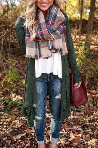 A plaid scarf can dress up even the simplest of outfits and allowing you to look like you’re ready for fall. A scarf helps any outfit by creating an accent piece, but the plaid looks great especially against the fall leaves and scenery.
