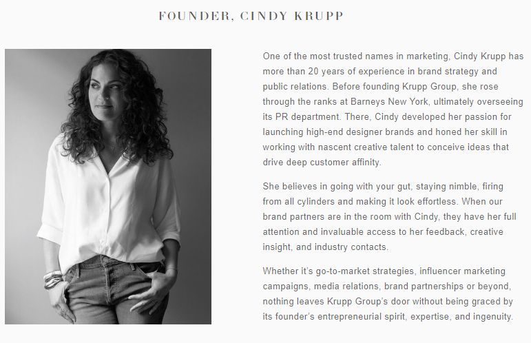 Krupp Group was founded in 2005 by one of the most trusted names in the marketing community, Cindy Krupp. Krupp, who has over 20 years of experience working in the PR and brand strategy industry, has built Krupp Group from the ground up. Her brilliance and passion for promoting high-end designer brands has launched her company in such a way that it has been able to expand its clientele exclusively by word of mouth. Krupp, a true visionary, has been quoted saying,